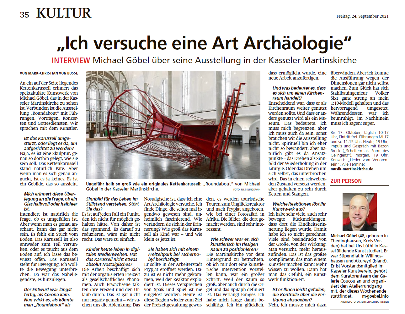 Interview Schreibe einen Kommentar / Von test_aussenstelle / 24. September 2021 Die Hessisch-Niedersächische-Allgemeine hat mich zu Roundabout interviewt. Eröffnung "Roundabout" "Roundabout" in Solothurn